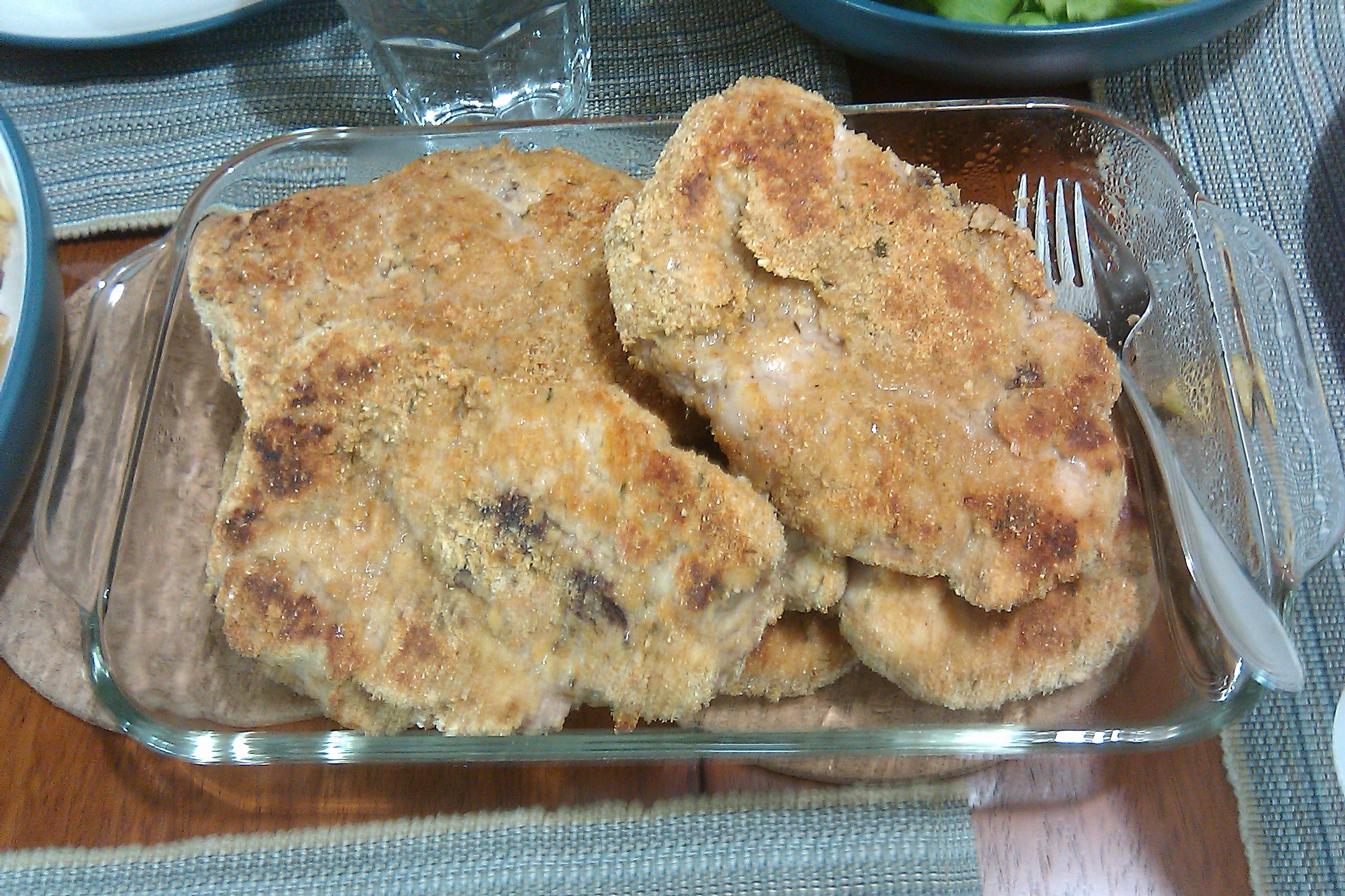 I had a craving for something not Chicken or Beef. Lucky for me, I had stocked my freezer with some boneless pork chops. With my friends coming over for dinner tonight, I wanted something hearty and easy to make, so I decided on this easy but delicious recipe. Pork chops are pretty lean and very easily dried out. Breading allows most of the moisture to stay in, without much fuss. My pork chops are thin cuts, so if you have a thicker cut of meat, you may want to flatten them or bake them in the oven after pan frying them.