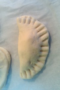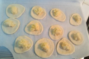 5. In each circle, add about 1 teaspoon of filling (depending on size of your circle), brush edges of circle with water and fold circle in half.