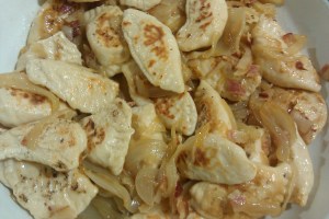 Cheddar Pierogies with sautéed Onions and Bacon