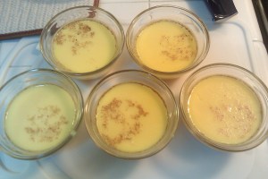 - Pour caramelized sugar into 8 custard cups (oven ready) and allow caramel to cool (10 minutes)
