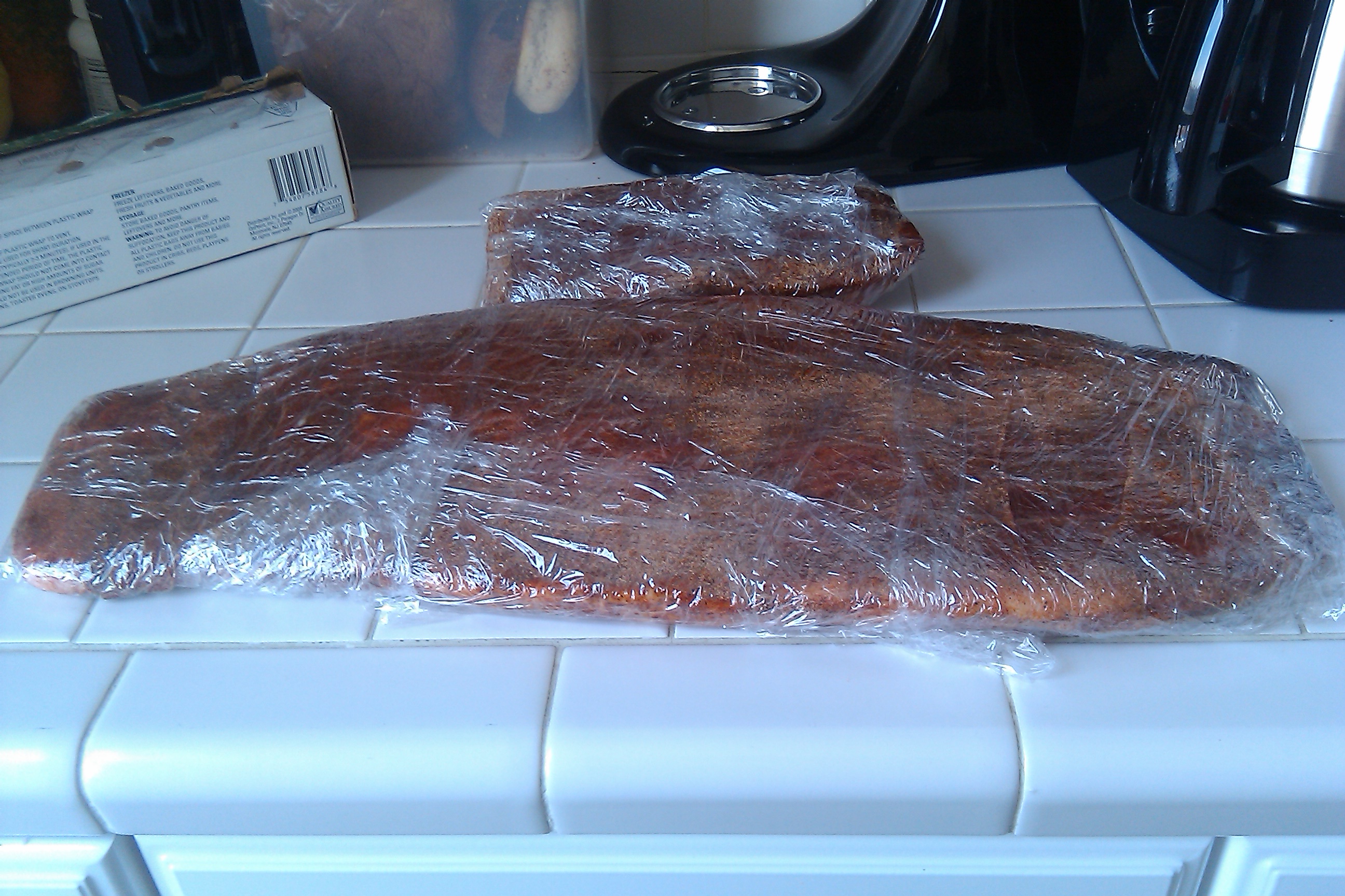 I removed the spareribs from my fridge. On the counter, I put several long layers of saran wrap (double them up!) bigger than the ribs. I placed my ribs on this saran wrap (weight down the corners of the saran wrap, so it doesn’t move). Then, I mixed together my spice rub and seasoned heavily, both sides of the spare ribs, pressing the spice into the meat.I then completely wrapped the spare ribs in saran wrap (wrap it well so there is no ripping or leaking!). Refrigerate for 24 hours.