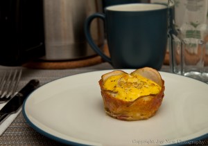 - Take a slice breakfast meat and line the bottom of a cupcake or muffin tin. (If you are using a lean meat, grease the muffin tin first).