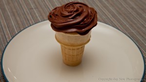 I had a craving for cupcakes the other day but I wanted to do something different (I get bored easily). I remembered, a long time ago,  of seeing a blog where the poster made cupcakes in ice cream cones. Well, seeing as I have been having a rough time with my hands lately (dry, cracking and cuts) I thought this would be a simple dessert. So I purchased some plain vanilla cones (the one with flat bottoms) and some chocolate icing (they sell them in a can that can be sprayed!!.