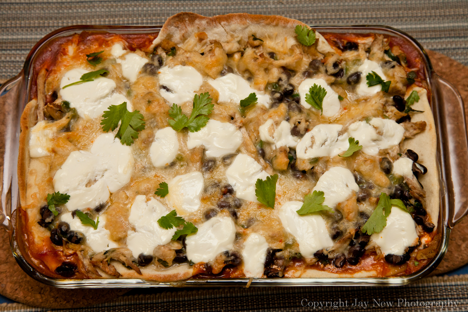 - Add a layer of sauce, tortilla and chicken and cover with aluminum foil