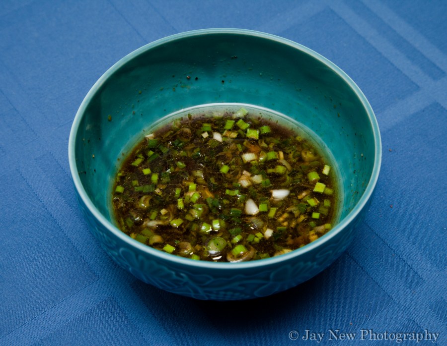 Scallions, Soy Sauce, Rice Vinegar, Sugar, English Mustard Powder, Vegetable oil, Sesame seed oil, sea salt and ground black pepper