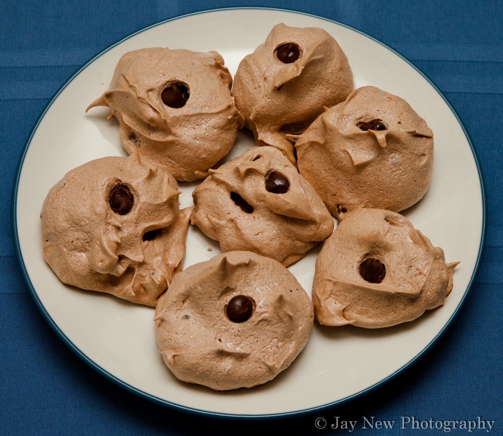 Meringues, for those of you, who have never tried them before, are fluffy, light desserts that crumble and melt in your mouth. They are crispy on the outside and sweet and airy on the inside. They are made of whipped eggs and sugar. Once you have this basis, you can add flavoring and colors to make many varieties of this delicious treat. I have never made meringues before but because of my new experience with whipping egg whites (In my recipe for Egg in the nest), I decided to give it a try. I wanted to make a different take on chocolate chip cookies and instead of placing the batter in a piping bag, I just made drop cookies. When I make these meringues again, I will probably cut the sugar in half. They are pretty sweet but highly additive. Without further ado: here are my results!