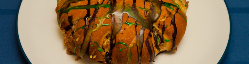 For my mother and grandmother’s visit, I decided that I would celebrate by having a themed night. It was Fat Tuesday and Mardi Gras, so I decided to make Jambalaya. No celebration is complete without dessert. So, I decided to make a cake that is often associated with Mardi Gras and Carnival. (It is also a popular dessert during Christmas). This cake, often has a plastic baby toy or bean hidden inside (I omitted for lack of plastic baby toys and didn’t want anyone to choke on a bean). Normally, the person who gets this piece has various privileges and obligations.