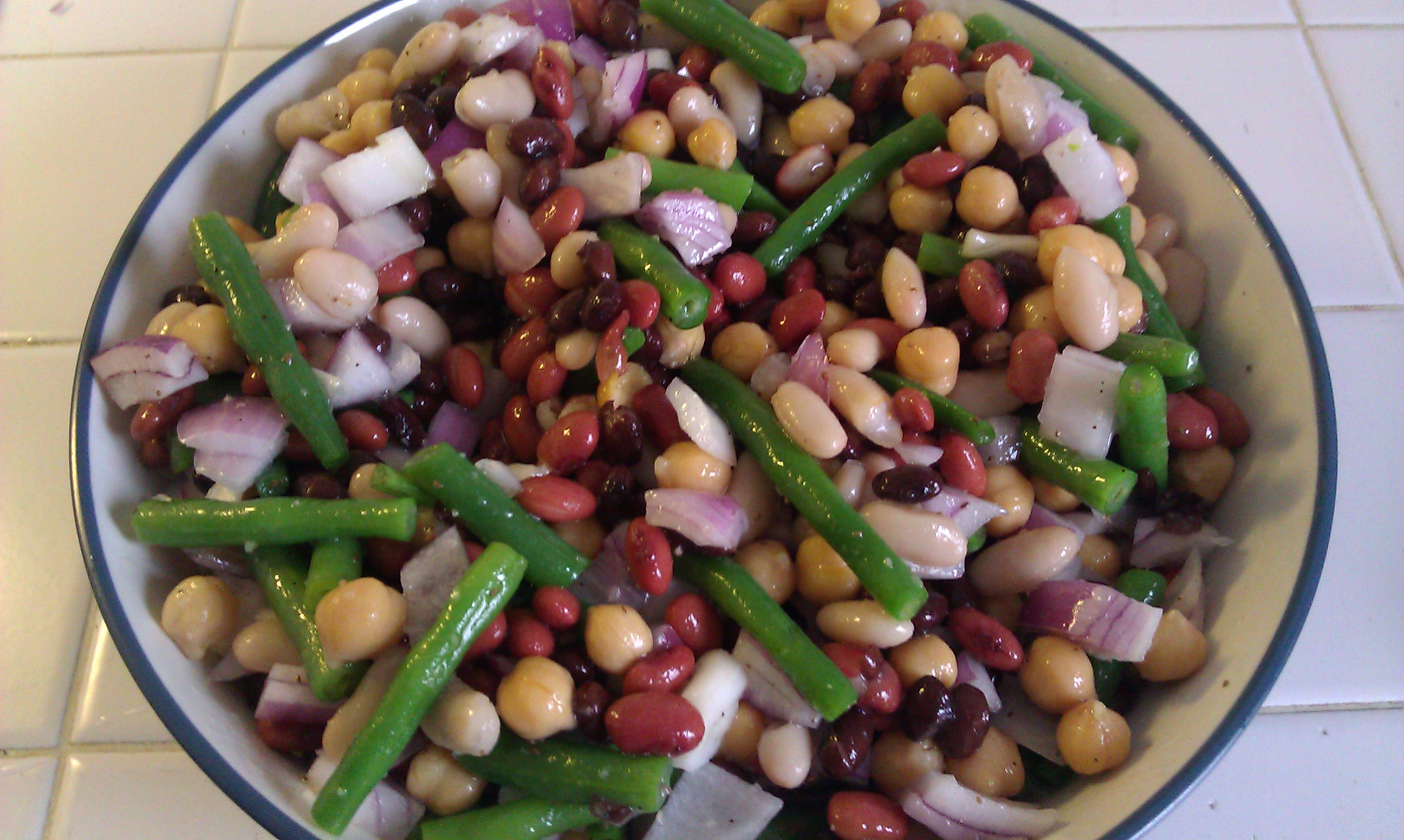 5 Bean Salad…What I like..it looks beautiful..I mean, I posted a picture on facebook, as soon as I finished making it. Its made of beans. I have been looking for ways to increase the amounts of beans (and variety of beans) in our diet (health benefits: lowers cholesterol, controls blood sugar, antioxidants, maintains weight/helps you reduce weight). There is not a lettuce in site. Lettuce is so messy to eat. This can be easily forked or spooned into the mouth. And finally another plus: Super Easy To Make. I am serving this tonight with a Cumin-Coriander Roasted Chicken and Spiced Sweet Potato Mash.