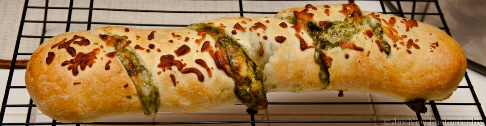 Still in the spirit of the success of my Pesto Bread Sticks, I was looking for a yummy snack for my husband and our friend. It was a cold and rainy day and I wanted something warm and comforting. I decided to do a variation of the Pesto Bread Stick recipe, by using my Italian bread recipe instead. The results were a really yummy, gooey slice of bread that was not only impressive but very moist and delicious. I have to make this again. I loved the fact that when our friend arrived, the house started smelling like baked bread and the fact that the entire loaf was consumed that evening, with some of my marinara sauce.