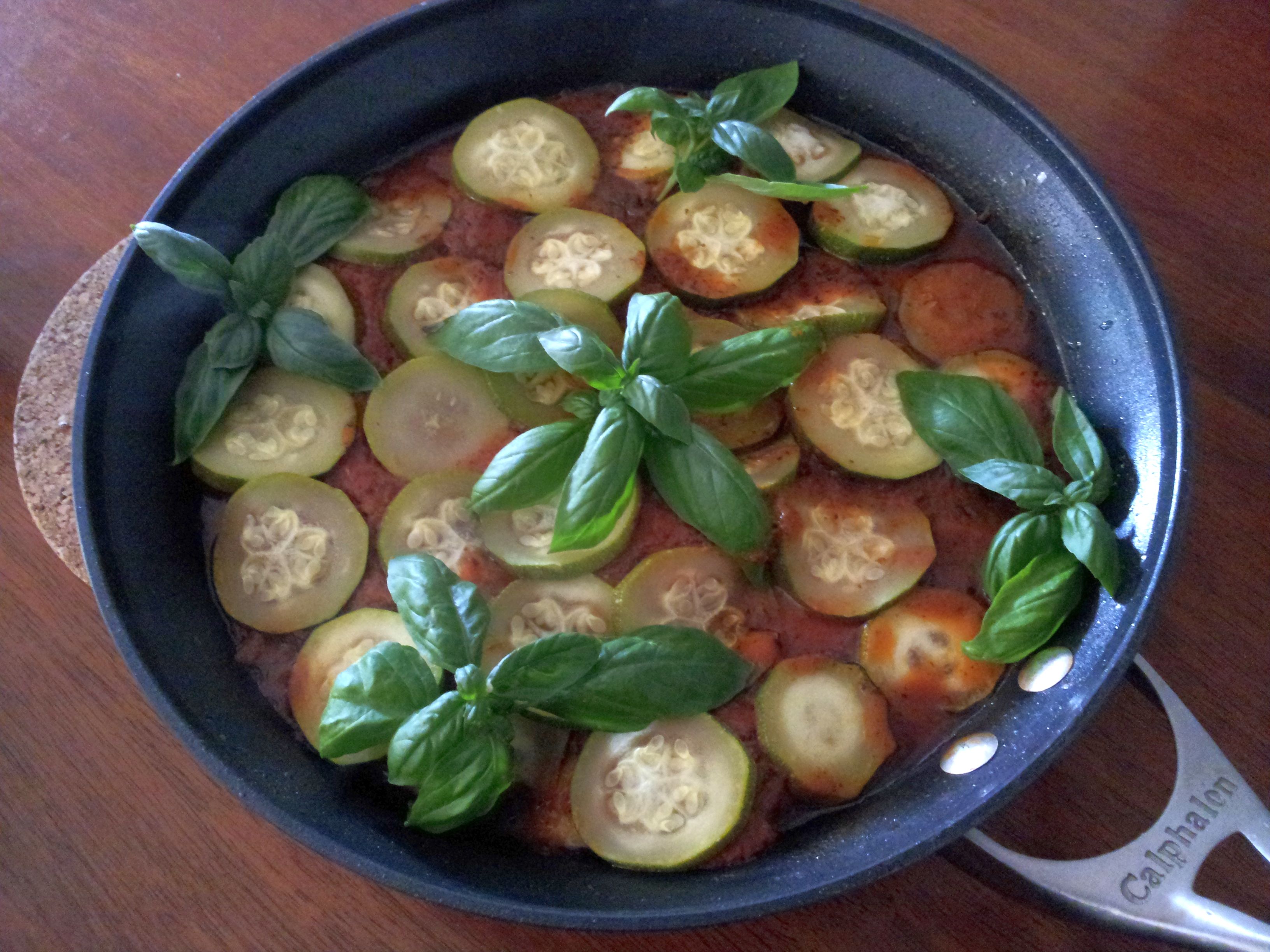 7. Place zucchini slices, decoratively over sauce and cover pan with a lid.