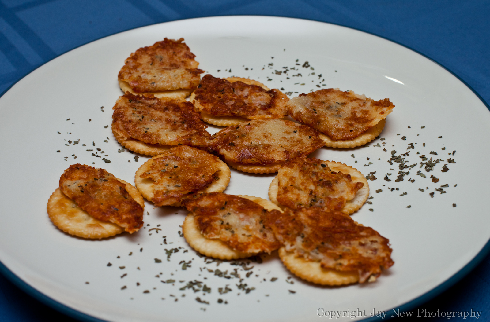 I am always looking/thinking for/of new snacks or appetizers. I started to think back to Thanksgiving. Every year I made a dish that called for Gruyère cheese and Parmesan. The dish is broiled until the cheeses melt and get crispy. After the meal is over, the one thing my sister and husband always go after is the crispy browned cheeses that stick to the bottom of that pan. Well, why not have that again? You can use any of your favorite cheeses (that you can melt and get browned) and a variety of different herbs. I used what I had and I ended up with a slightly salty but crispy yummy cheese crust. I placed them on Ritz crackers and Tada! and appetizer is born.
