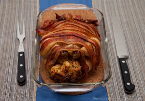 Normally, this is not a dish I would make but seeing there was a blue moon out tonight (this is my excuse and I am maintaining it), I had to make it. My husband and I received a The Bacon Cookbook, from some good friends this Christmas. Since then, I have heard nonstop about bacon from my husband. So, I decided to have some fun. On YouTube, there is a group of men, that every Tuesday, post a new video of some epic creation they make. I first saw their video during Thanksgiving where they proceeded stuff  a bird, in a bird, in a bird, in a bird, in a bird, in a pig…. They then sat down and ate the entire creation. I believe that the total calorie count was about 80,000 calories! The video can be viewed here.