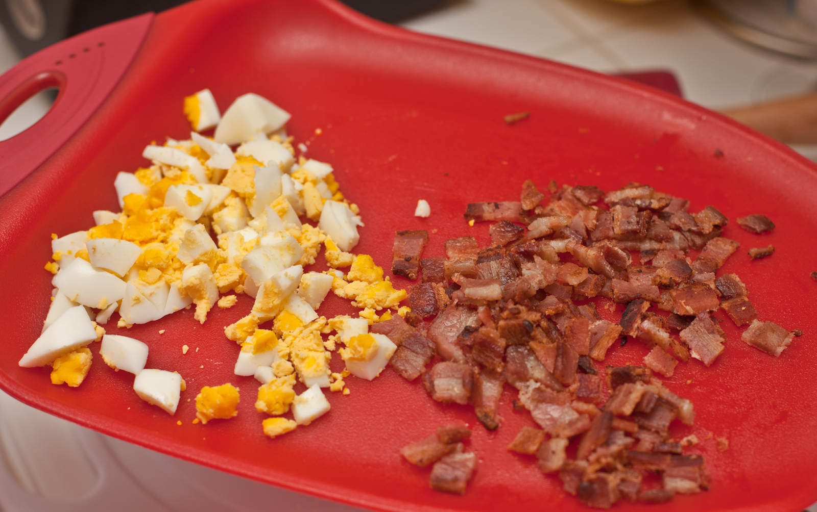 - Fry up your bacon until crispy and place on paper towels to remove excess oil. Chop into small pieces
