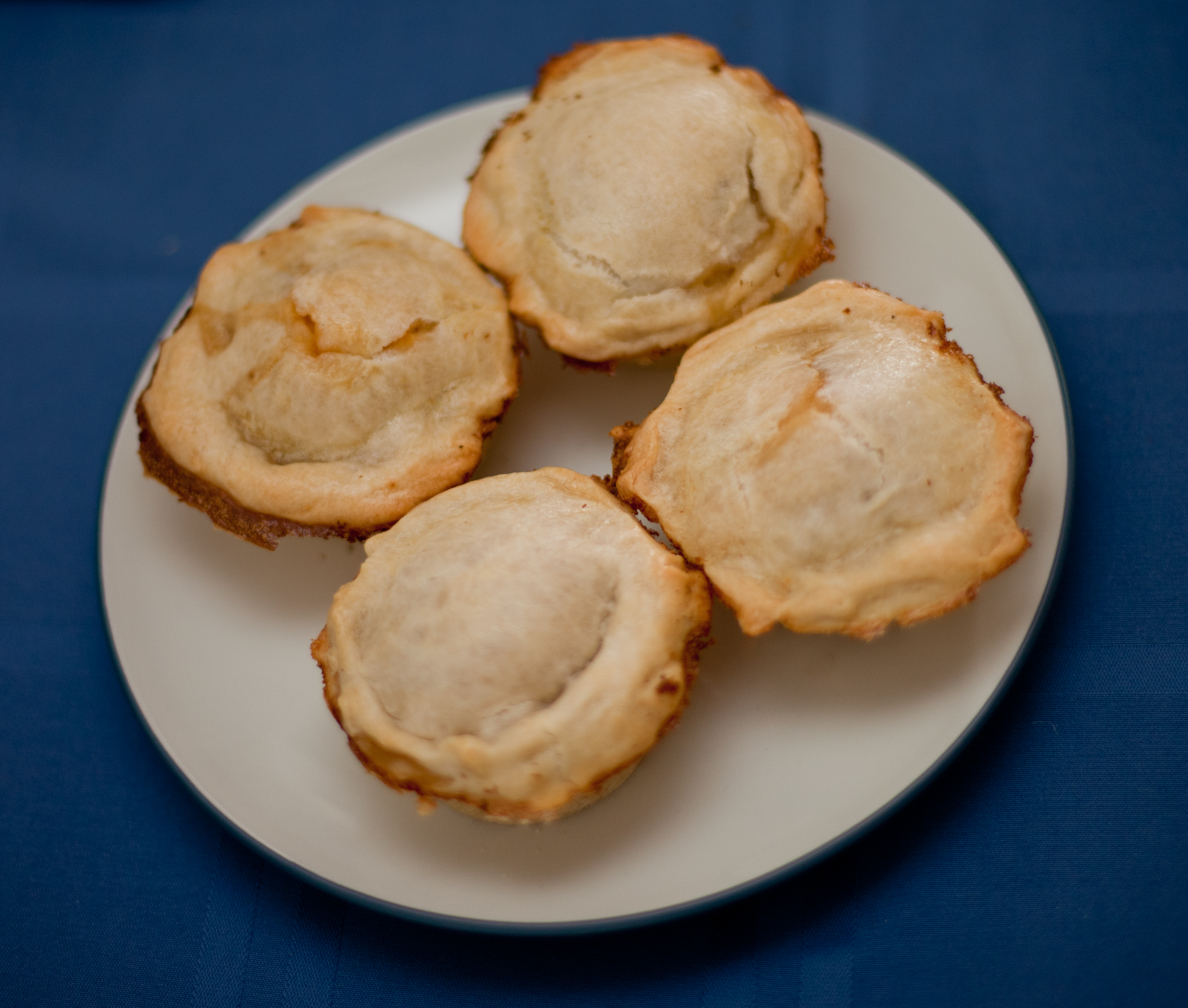 - Roll out 4 more circles and cover each pie, sealing the edges and cutting away any excess dough