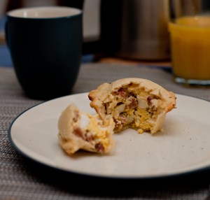 I found a recipe in the Bacon cookbook, that was right up my ally. English Bacon and Egg Pie. It is a simple dish that satisfied what I craved (boiled egg) and him (bacon). Plus, his hobby is taking pictures, so it was an idea time to make a new dish. So, using this recipe as inspiration, I decided to make mini Bacon and Egg Pies for breakfast. This recipe is adapted from The Bacon Cookbook and the pictures were taken by my husband.