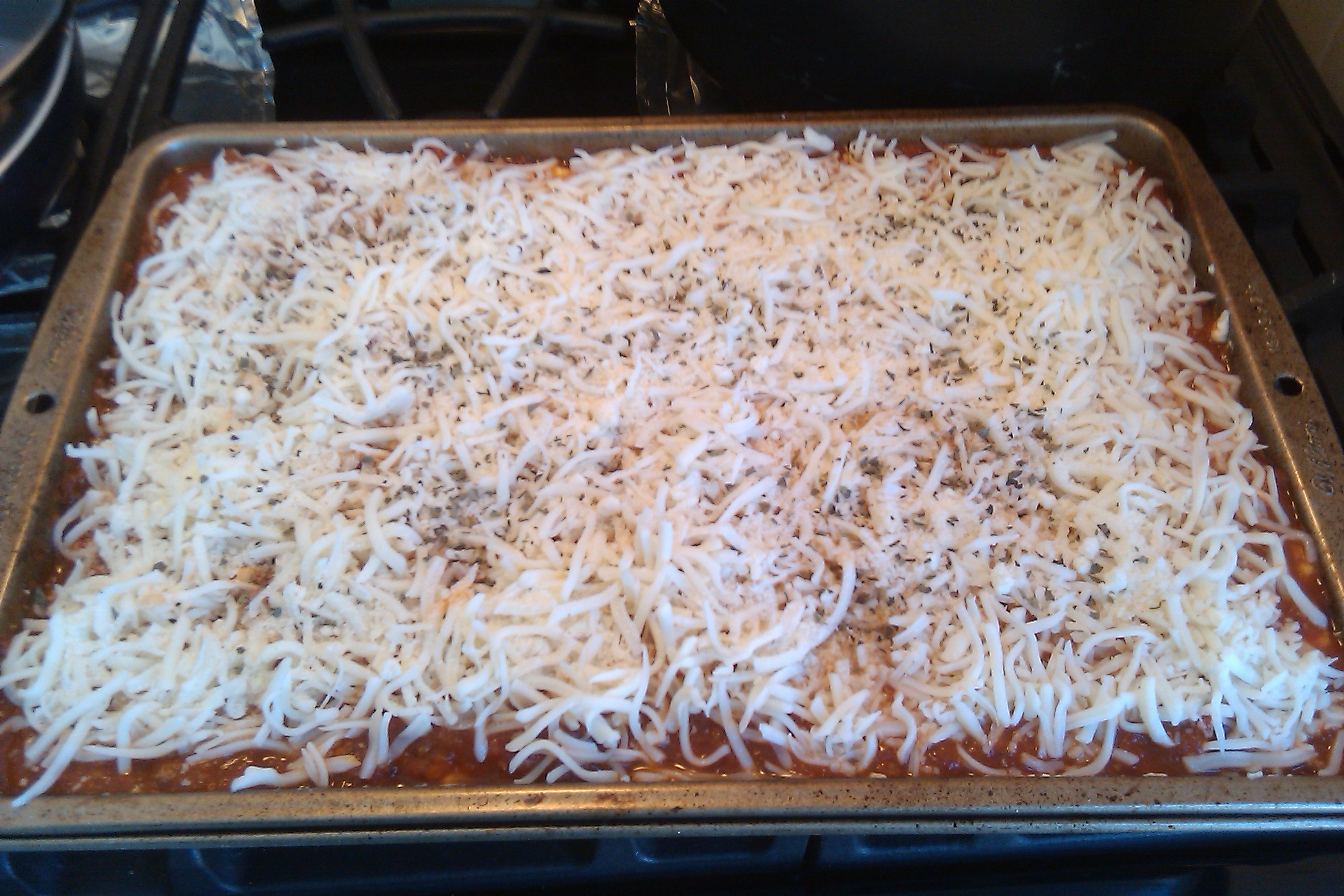4. Coat the bottom and insides of your lasagna pan (baking pan) with meat sauce.