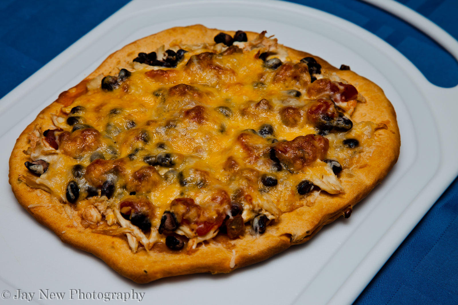 - Quickly top the cooked side with chicken, black beans, salsa and cheese.